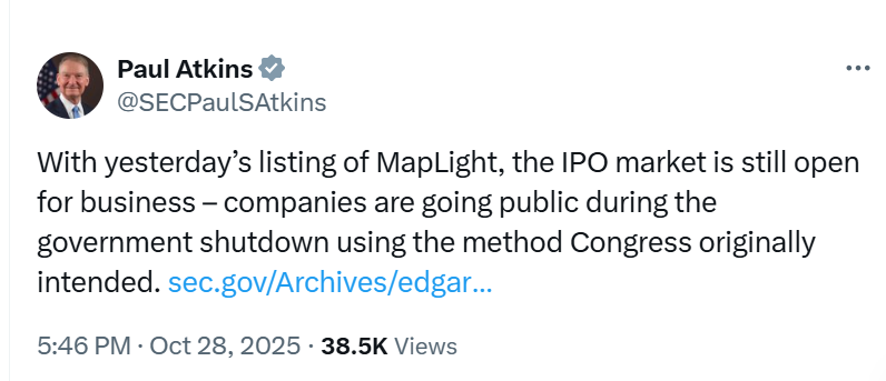 As highlighted in this press release – and this related case study – Cooley was issuer’s counsel in the MapLight Therapeutics IPO that priced earlier this week. It’s a rarity for an IPO to price during a government shutdown (and Cooley helped Navan price an IPO yesterday, so two historic IPOs in a single week). So much so that SEC Chairman Paul Atkins tweeted about the deal: