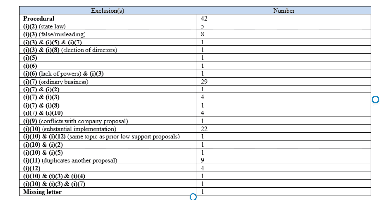 2. Of these 141 Rule 14a-8(j) notifications with a staff response, here is what was argued by the company: